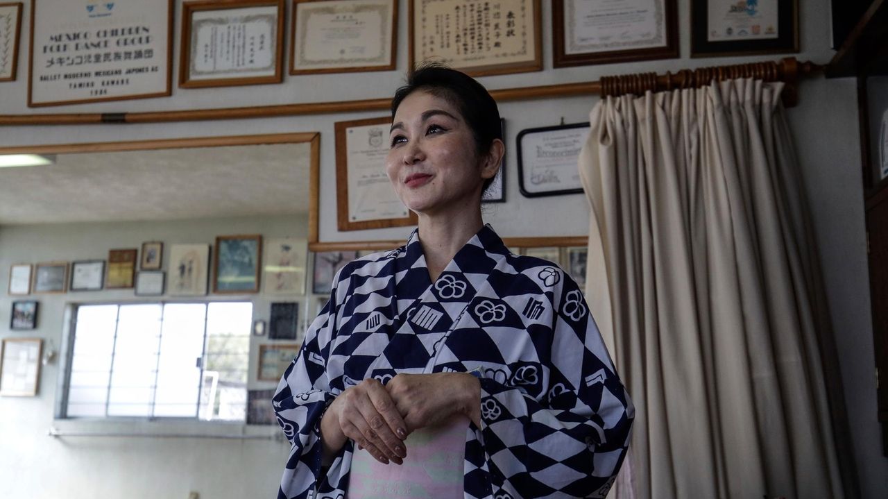 日系人7万6000人が暮らすメキシコシティのダンススタジオで、白と紺の着物に身を包んだ木原さんは、「私たちは体で泣くから、表情が少なくなるのです」と語った。
