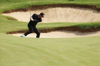 水戸ペレイラは9時にグリーンのリーディングエッジでバンカーを見つけ、ピンから約12フィートの砂からフィールドを引き出します。